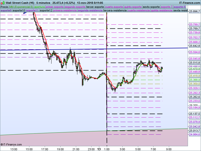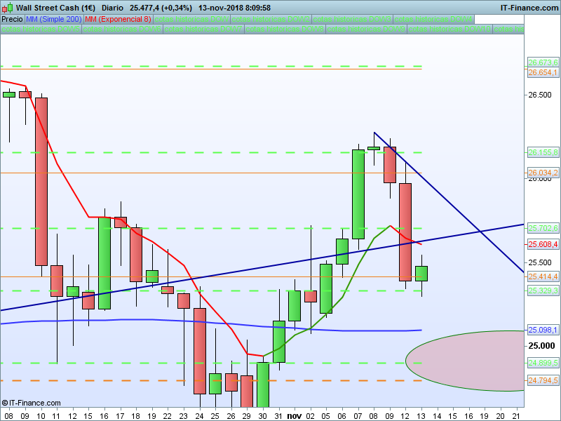 DOW JONES,08:08:30.- El escenario bajista se cumplió a la perfección y cerramos justo en el SOR 25414, lugar donde estamos en estos momentos. Mientras permanezcamos por debajo de esta cota los objetivos son buscar la media de 200 sesiones y el PAA en extensión. Patrón 1-3 realizado durante la sesión asiática.