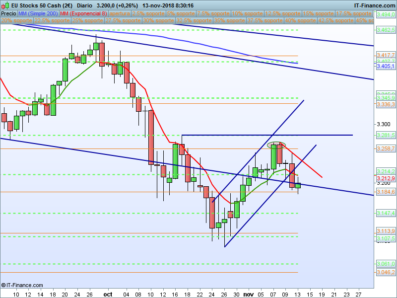 STOXX50,08:30:57.- De SOR a SOR, el rechazo de 3258 nos ha llevado de nuevo al SOR 3184. La pérdida de esta cota nos puede llevar al refugio 3147 y en ese punto veremos si tenemos continuidad bajista.