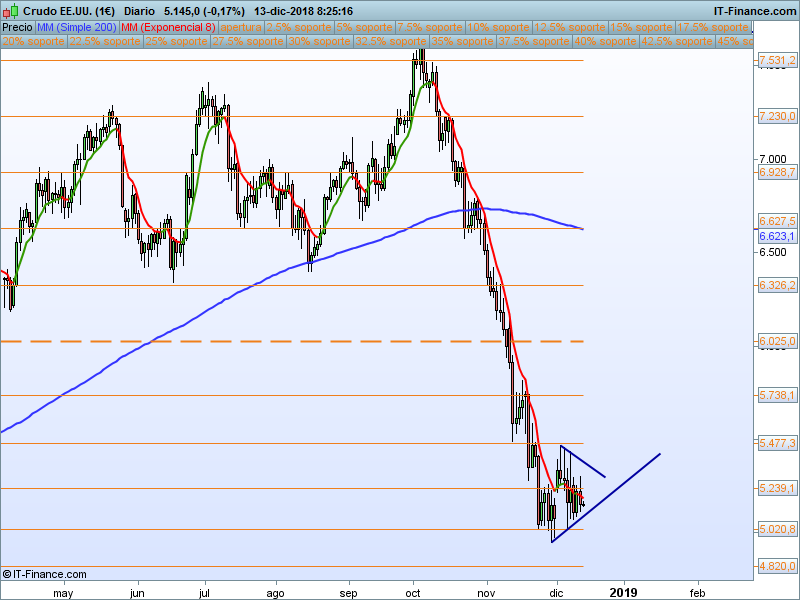 WTI,08:24:18.-El precio sigue comprimiéndose dentro de la formación triangular marcada, de momento no mucho que hacer, salvo tramos con apoyo en las cotas de intradía.