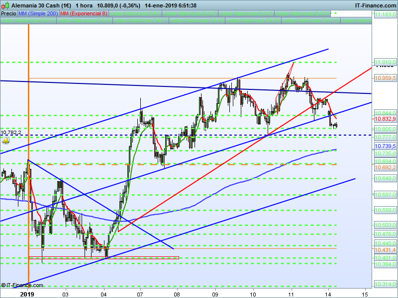 DAX Xetra,06:48:41- Tras varios días intentando superar el SOR 10959 sin éxito tenemos hoy apertura con hueco a la baja donde el recorrido más probable será el PAA 10692 en caso de superar el mínimo del pasado jueves.