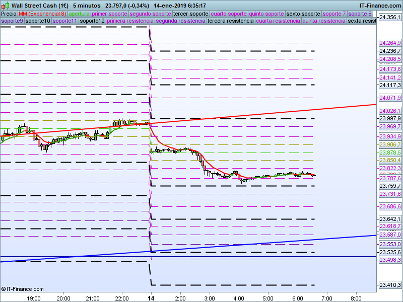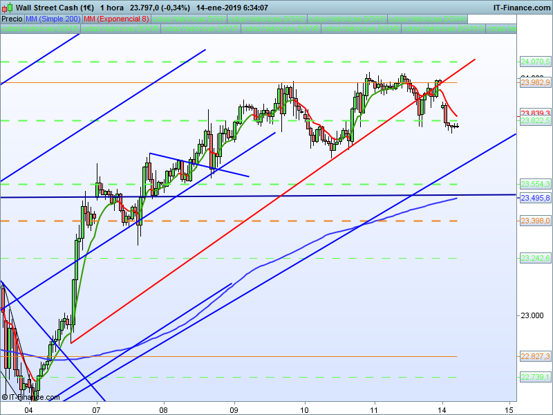 DOW JONES,06:32:24.- Abrimos con hueco a la baja por debajo del mínimo del pasado viernes. A la cotización se le está atragantando el SOR 23982. Mientras no tengamos cierre por encima de este, el planteamiento será venir a buscar la parte baja del canal.