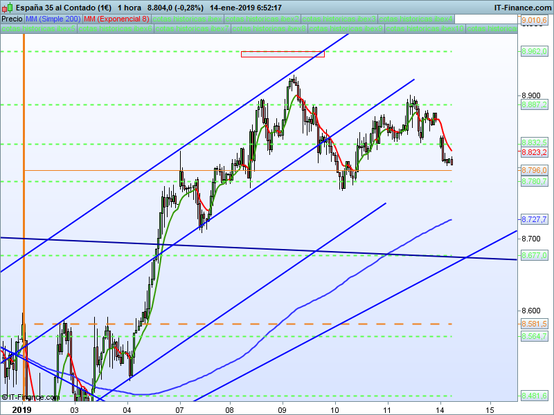 IBEX35,06:52:03.- Seguimos por encima del SOR 8796 a la hora de realizar el análisis. Es el primer muro de contención que nos vamos a encontrar a muy corto plazo. Si lo perdemos vamos a tener un recorrido probable hasta el refugio 8677 en donde tenemos confluencia de niveles.