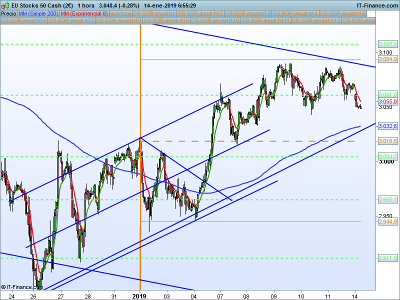 2019-01-14 APERTURA GLOBAL.07:04:14.- Arrancamos una nueva semana y lo hacemos con huecos a la baja en los mercados tras ver como se nos han atragantado de momento los primero SORs relevantes por encima del precio de apertura anual. El caso es muy claro en el Dow Jones en Wall Street y DAX Xetra en Europa, a los que podríamos poner el cartel a muy corto plazo de índices directores. No han podido con sus primeros objetivos tras alcanzarlos.