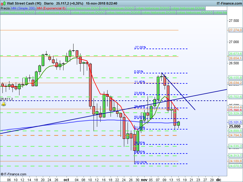 DOW JONES,08:21:05.- Hasta la media de 200 sesiones. En ese punto estamos ahora, mientras estemos por abajo lo más probable será ir a buscar el PAA. Cierres por encima de 25414 nos pueden dar validaciones alcistas.