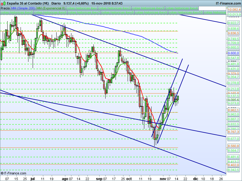 IBEX35,08:36:31. – Ayer tuvimos vela de indecisión por debajo del SOR 9165, cierres por encima nos predisponen a buscar el 9379.