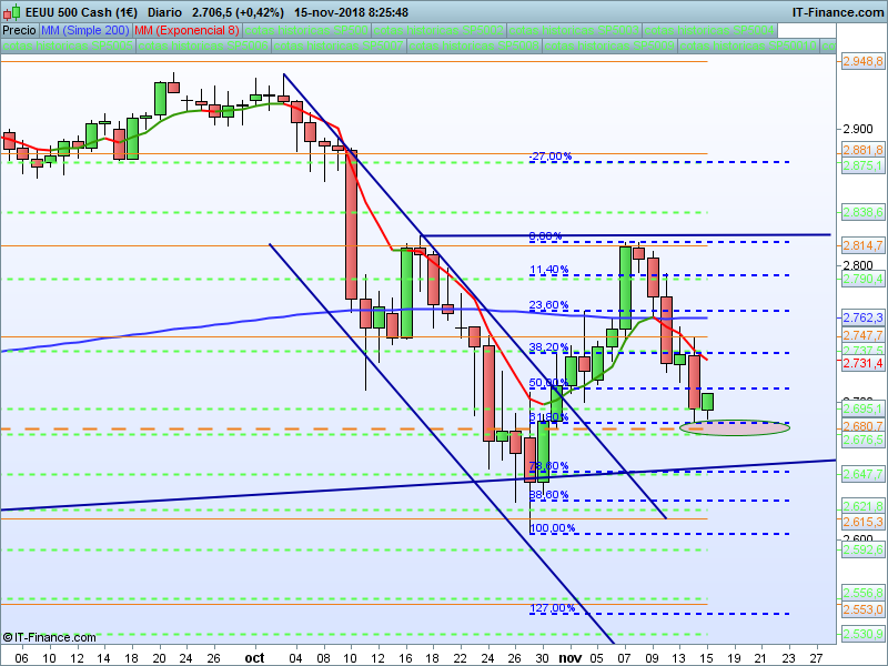 SP500,08:23:27.- El precio llegó justo al 61.8 del retroceso del último impulso alcista y se giró. Se ha quedado muy cerca del PAA. Cierres por encima de 2747 nos harán pensar en el escenario alcista. Por el contrario, si perdemos el PAA, consideraremos como más probable la opción bajista.