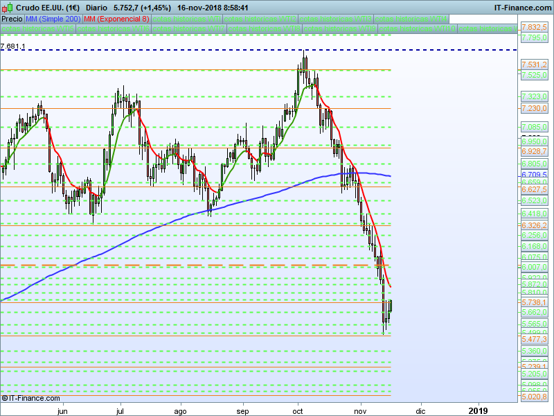 WTI, 08:58:03.-Sin cambios en el planteamiento de ayer jueves: » experimentó una ligera corrección que le llevó al SOR 5738, allí se giró cerrando lejos de máximos. Antes de incorporarnos debemos ver una corrección mayor. Pensamos en el PAA».
