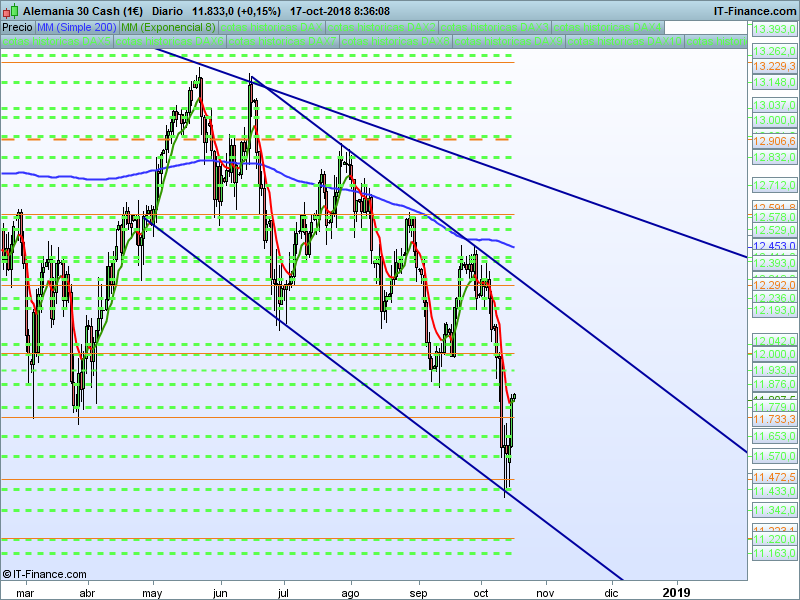 DAX Xetra,08:36:51.- Tenemos 2 mínimos que nos permiten trazar un canal. Tras testear durante 3 días el SOR anual 11472, hemos conseguido rebotar superando en el cierre el SOR 11733. Mientras se mantenga por encima, lo más probable es que continuemos hasta el siguiente en 12006. Recordamos que se trata de un rebote, no habrá evidencias de cambio de tendencia hasta que no tengamos un cierre por encima de 12411.