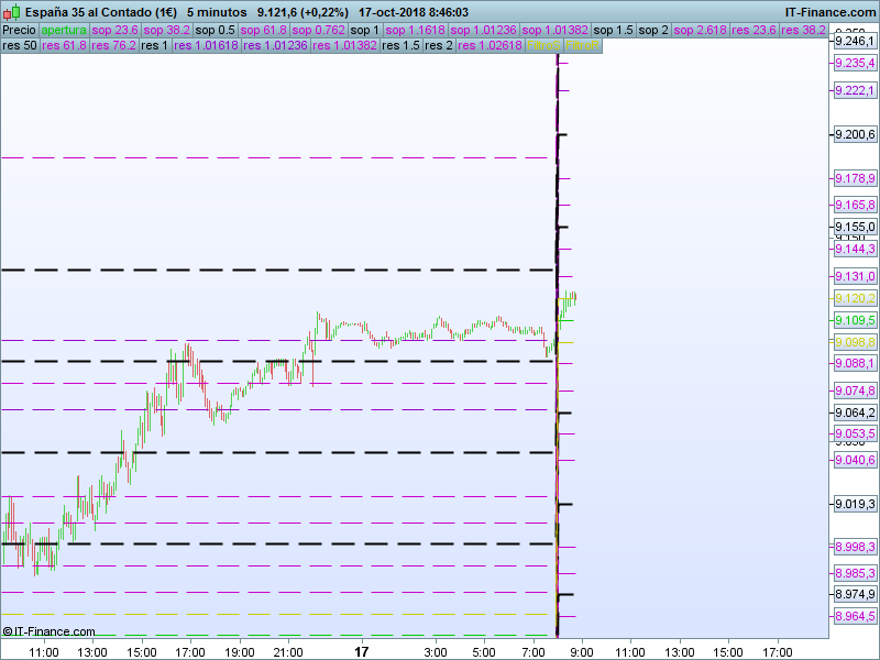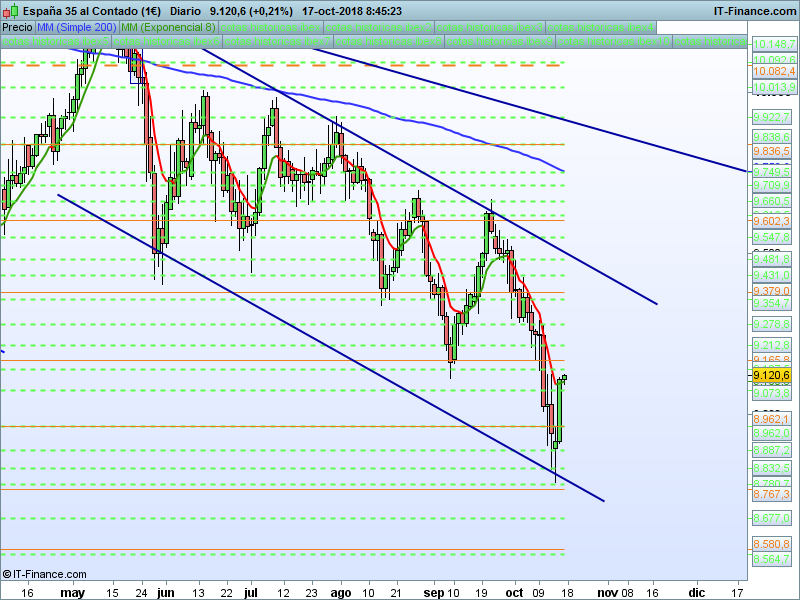 IBEX35, 08:41:54. También disponemos ya de dos puntos claros por abajo con los que delimitar un nuevo canal bajista. Cierre muy por encima del SOR 8962 y estamos cerca del SOR anual 9165, que contuvo el mínimo anual de septiembre. Vamos a ver lo que hace al llegar a esa zona. La evidencia del cambio de tendencia la seguimos teniendo en la zona 9602.