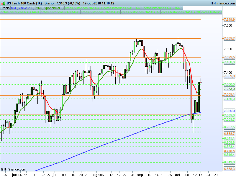 Nasdaq100, 11:07:57. Cierre por encima del refugio 7300, pero tenemos a continuación el SOR anual 7369. Mientras esté entre estos dos niveles, mejor no operar. Por encima de 7369 podemos plantear la búsqueda del 7488, por debajo de 7300 deberíamos buscar apoyos en el SOR anual 7209.