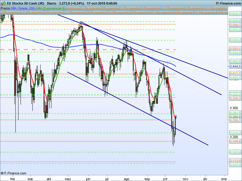 STOXX50, 08:46:33. También cierre por encima de SOR anual, en este caso 3258. Tenemos el refugio histórico 3281 que ha dado soporte al precio hasta en 4 ocasiones este año, en caso de cierre por encima de esta cota, deberíamos ir a buscar el siguiente sor anual en 3336.
