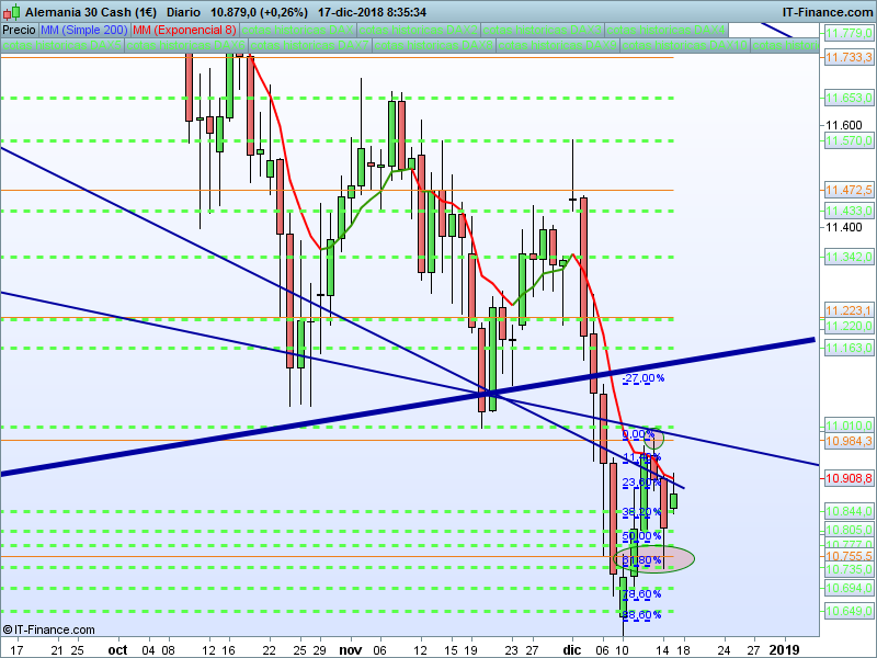 DAX Xetra,08:32:57.- Terminó la semana rebotando en el SOR 10755 y lejos de la zona de mínimos. Hoy hueco al alza en apertura asiática. El nivel clave a superar serán los cierres por encima de 10984. La línea 2-4 (de trazo muy grueso) de largo plazo es una losa muy importante.
