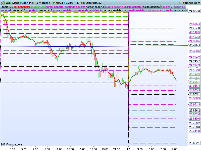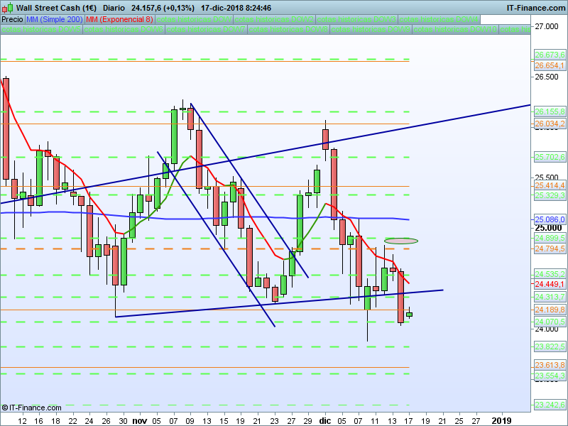 DOW JONES,08:22:39.- Cierre semanal por debajo del SOR 24189, punto en el que nos encontramos en el momento de escribir estas lineas. Mientras permanezcamos por debajo hay que pensar en la consecución de nuevos mínimos trimestrales y posiblemente anuales. Zona bisagra en 24794 PAA.