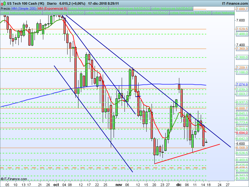 NASDAQ100,08:27:45.- Se consiguió cerrar por encima del SOR 6568, pero con vela del viernes de implicaciones muy bajistas. Muy cerca de la LT de corto plazo trazada cuya ruptura y confirmación con cierre por debajo de la coa señalada nos abriría las puertas para buscar el PAA en 6408.