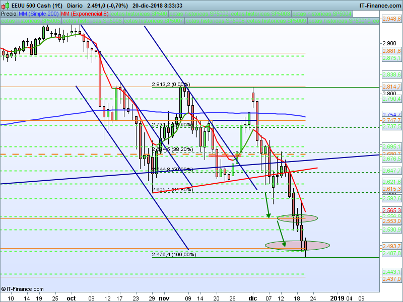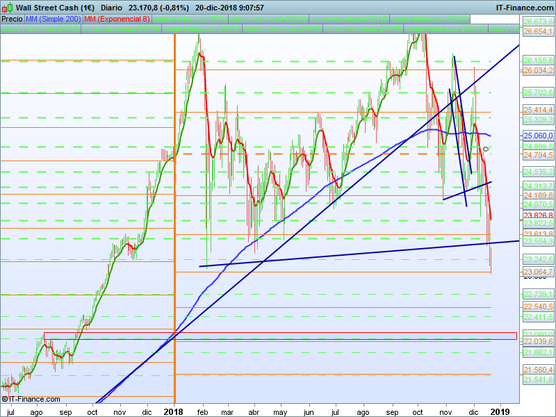 DOW JONES,09:09:30.- De SOR a SOR para marcarse una vela diaria de casi 1000 puntos de rango. Parada en el SR 23064, nuevos mínimos anuales y un 7% por debajo del precio de apertura anual. Mucho ojo, por que a nivel técnico, la pérdida de estos niveles nos abre un vacío de precios importante hasta la zona de 22.000.