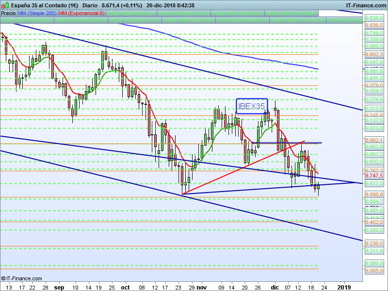 IBEX35,08:40:44. – Nos ha dolido, el hecho de quedarnos a escasos puntos del SOR 8580. Eso no quita que hayamos hecho un nuevo mínimo anual, mientras estemos por debajo del SOR 8767, predisposición bajista.