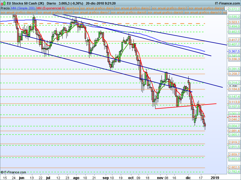 STOXX50,09:18:23. Al igual que el Ibex nos hemos quedado a escasos puntos del SOR 2981. El punto de reversión sigue siendo el 3113 y mientras se mantenga por debajo debemos mantener predisposición bajista. Este SOR puede ser un soporte que nos de apoyo, importante ver los cierres de velas.