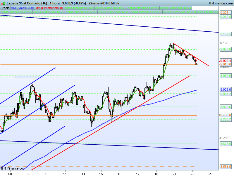 Hemos venido a apoyarnos en el SOR 9010, es importante para no perder la predisposición alcista a corto que no perdamos este nivel. Por encima de 9010 los objetivos siguen estando en la LT bajista y SOR 9225 en extensión.
