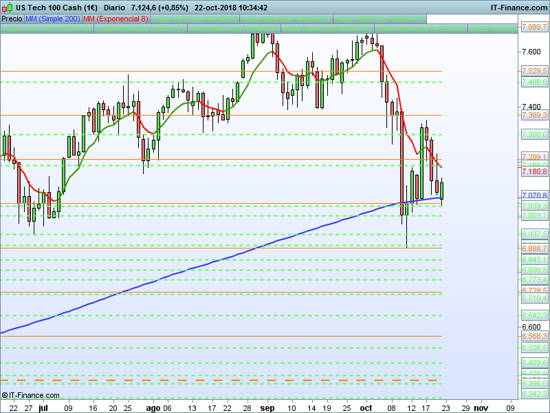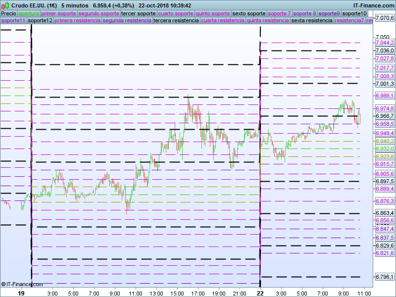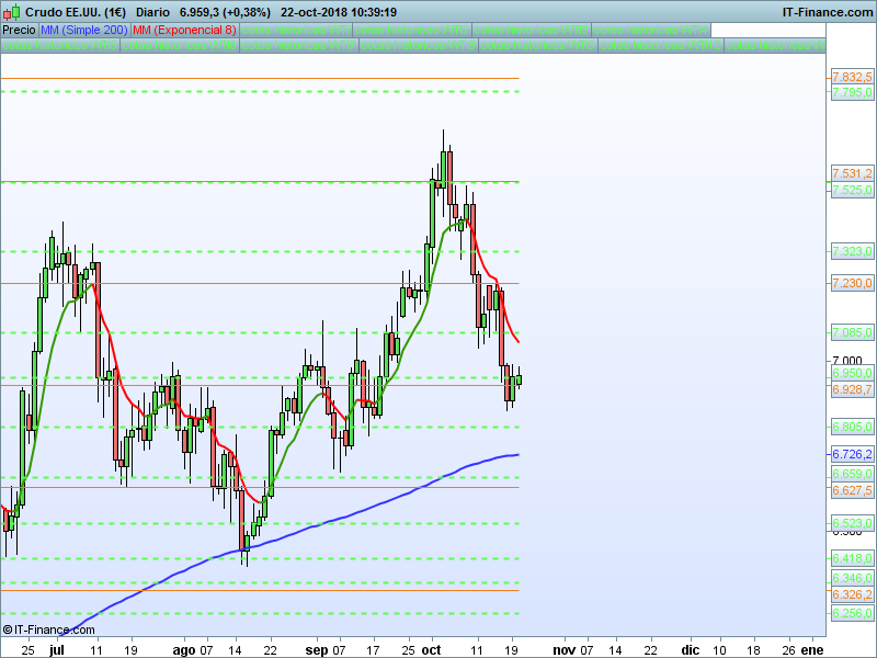 Crudo Ligero WTI, 10:36:16.- De momento, el SOR 6928 ha frenado el avance bajista, mientras permanezca por encima podemos lateralizar e ir a buscar el refugio 7083. Cierres por debajo del SOR nos predispondrán a buscar la media de 200.