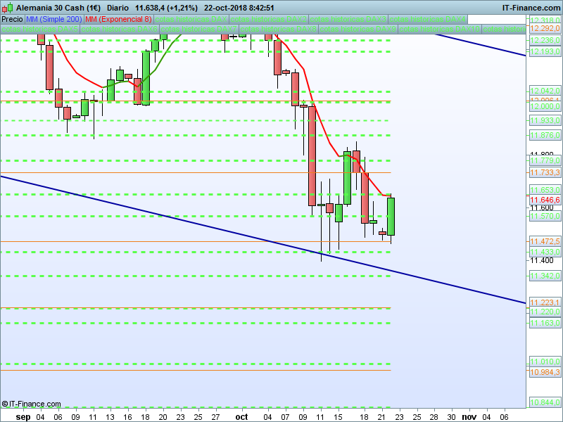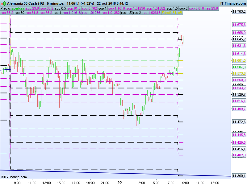 DAX Xetra,08:40:21.- El SOR 11472 ha frenado de nuevo al precio. En preapertura ya nos hemos ido a la tercera cota alcista intradía. Vamos a interpretar que estamos realizando una C dentro de la corrección, con lo que deberíamos tener un nuevo rebote alcista desde el mencionado SOR. El cierre por debajo de esta cota abriría el camino a otro tramo bajista, en principio hasta el SOR anual 11223.