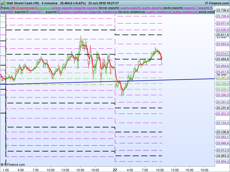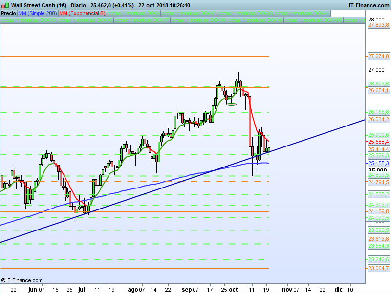 DOW JONES, 10:20:19.- Estamos enredados en el triple soporte que forman la LT, el SOR anual 25414 y el refugio 25329. Por si fuera poco, un poco más abajo tenemos la media de 200, en la que se ha intentado perforar pero no hemos tenido cierres por debajo de ella. Vamos a fijarnos en cierres por debajo del SOR anual por que esta señal puede desencadenar tramo bajista.
