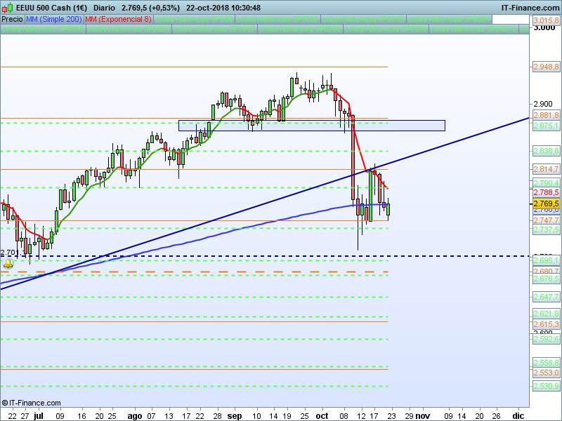 SP500, 10:28:30.- En este caso, nos hemos vuelto a colocar por debajo de la media de 200 sesiones. El nivel a vigilar es el SOR anual 2747, si el lector de fija, desde el jueves 11 se ha perforado en varias ocasiones pero no hemos tenido ningún cierre por debajo de este nivel. El PPA lo tenemos relativamente cerca, por lo que pensamos que sería un buen objetivo en caso de cierre por debajo de 2747