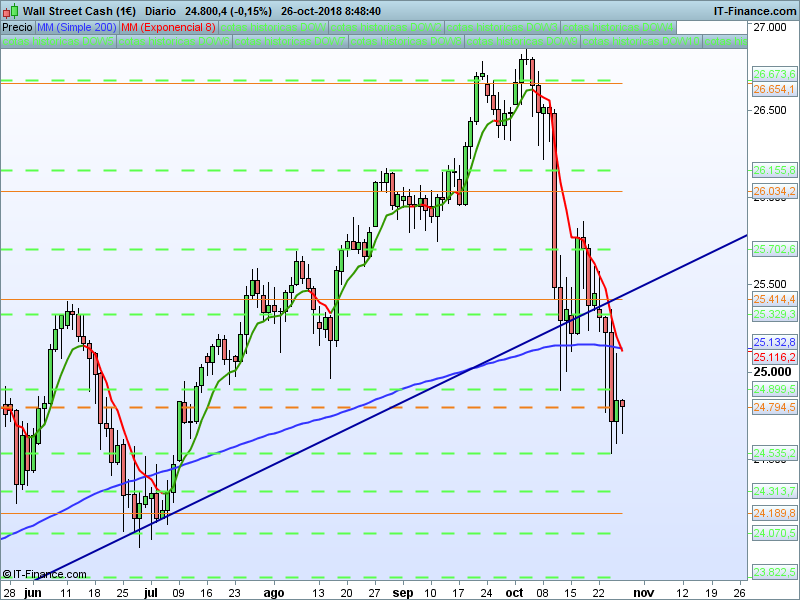 DOW JONES, 08:46:40.- Pues retesteó la media de 200 sesiones como esperábamos, el rechazo se produjo fuera de horas desvirtuando mucho el cierre oficial. En estos momentos la cotización se encuentra pegada al PAA.