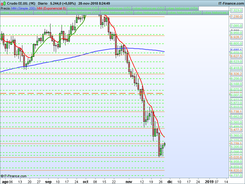 WTI,08:22:42.- Enlazamos un par de días con cierre positivo, pero no hemos avanzado mucho en el rebote, a estas horas estamos justo en el SOR anual 5239. Veremos si el 5020 le ha dado soporte a la cotización.