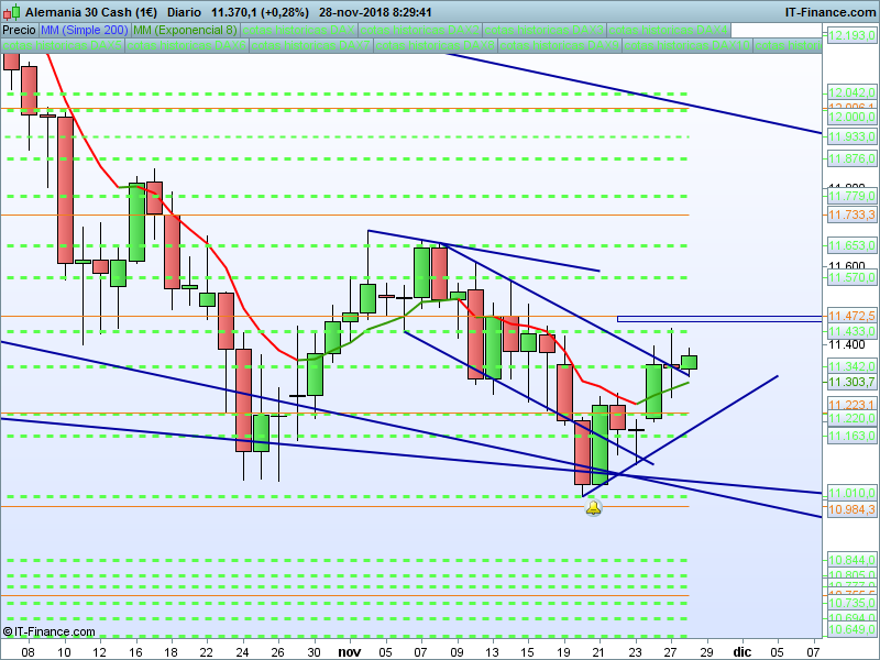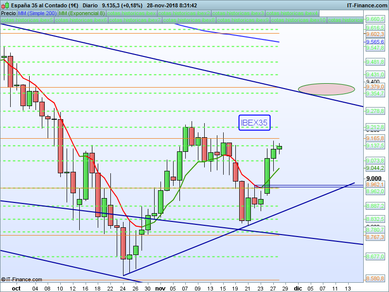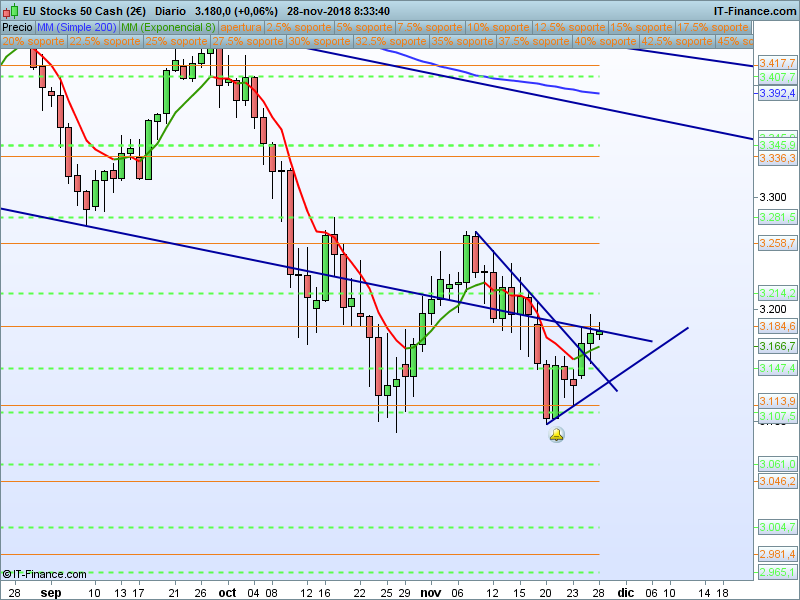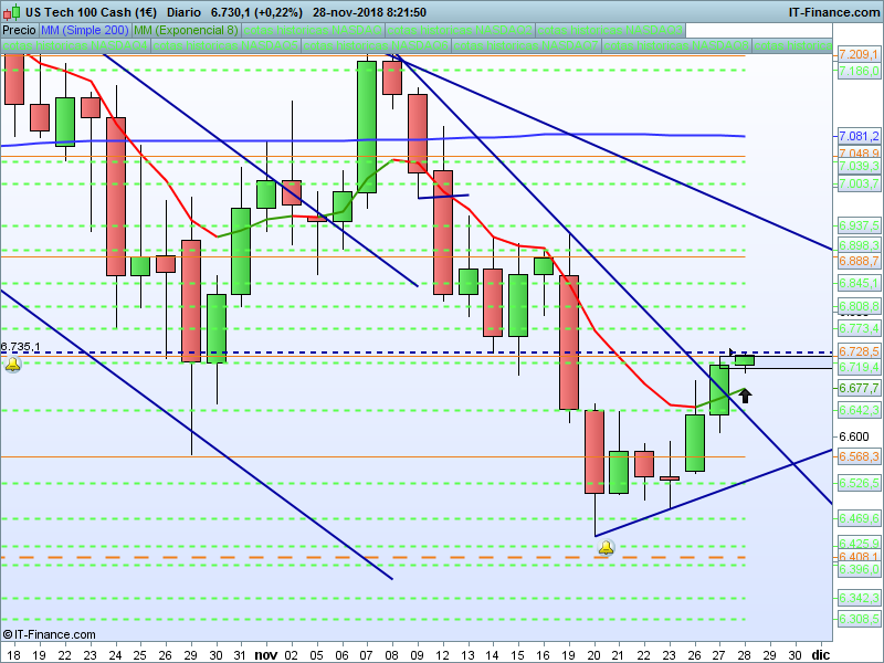 2018-11-28 APERTURA GLOBAL. 08:05:05.- Ayer tuvimos una jornada de rango reducido en la que seguimos viendo escaso volumen de negociación. Los índices americanos alcanzaron los puntos de resistencia clave para empezar a pensar en que el Rallie de Navidad es posible. El sector tecnológico se sigue mostrando más débil y su reacción alcista quizás sea el catalizador que necesita el mercado para intentar un rebote de mayor calado. Estamos ante los últimos días del mes y estacionalmente hablando se trata de los días más alcistas del mercado junto con los primeros días del mes. Pese a las alzas, solo el 36% de los valores negociados en los mercados USA presentaron un cierre alcista.