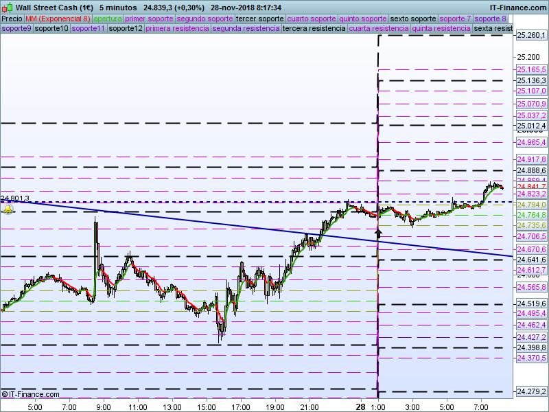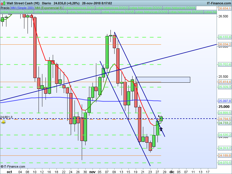 DOW JONES,08:13:47.- Ayer tocamos el PAA en 24794.5 y vamos a estar atentos hoy a cierres por encima, ya que es el primer nivel que requerimos para intentar el asalto al rallie de navidad. Hay que tener mucha precaución ya que seguimos por debajo de la media de 200 sesiones. Sería conveniente ver un pico de volumen que favorezca la arrancada.