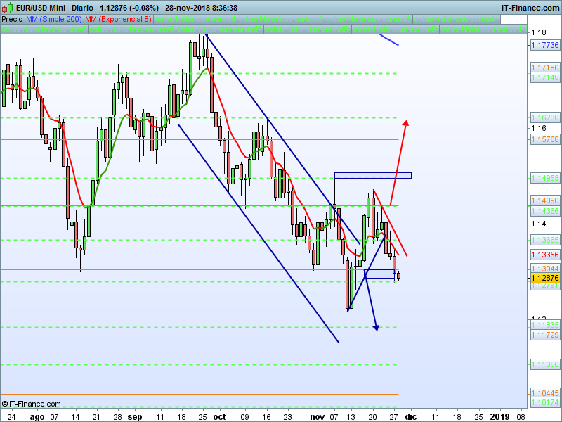 EURUSD,08:35:01.- Parece que hemos roto el tramo de lateralización por la parte de abajo con cierre por debajo del importante SOR 1.13044. Mientras estemos en esta situación, el objetivo vuelve a ser el SOR anual 1.11729