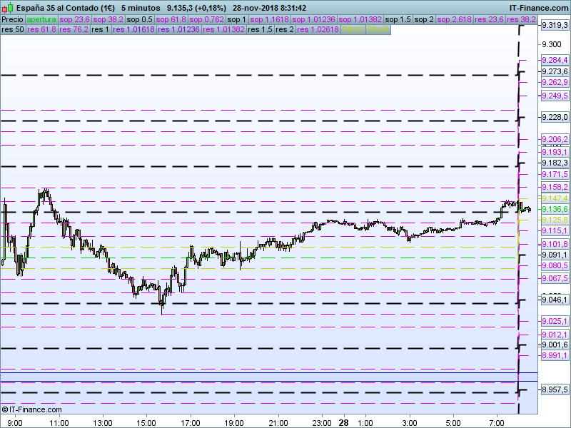 IBEX35,08:30:42. – Nos quedamos algo por debajo del 9165 SOR, el cierre por encima nos confirmará el movimiento hasta el 9379. Mientras estemos por encima del 8962 SOR nuestra predisposición será alcista a corto plazo.
