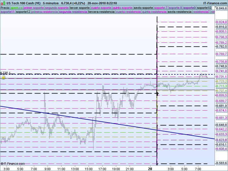 NASDAQ100,08:20:11.- Ayer cerramos justo por debajo del SOR 6728 y en estos momentos estamos justo ahí. Un cierre por encima de este nivel nos predispone a buscar en primer lugar el 6888. Si cerramos por debajo de 6728 podemos lateralizar hasta el 6568