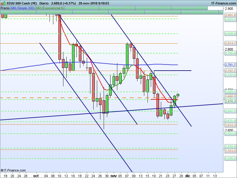 SP500,08:18:24.- Ayer se cerró algo por encima del PAA 2680, siendo este el primer nivel que tenemos señalado para un posible giro. Mientras permanezcamos por encima vamos a considerar que iremos a buscar el 2747 y especial atención a la media de 200 sesiones.