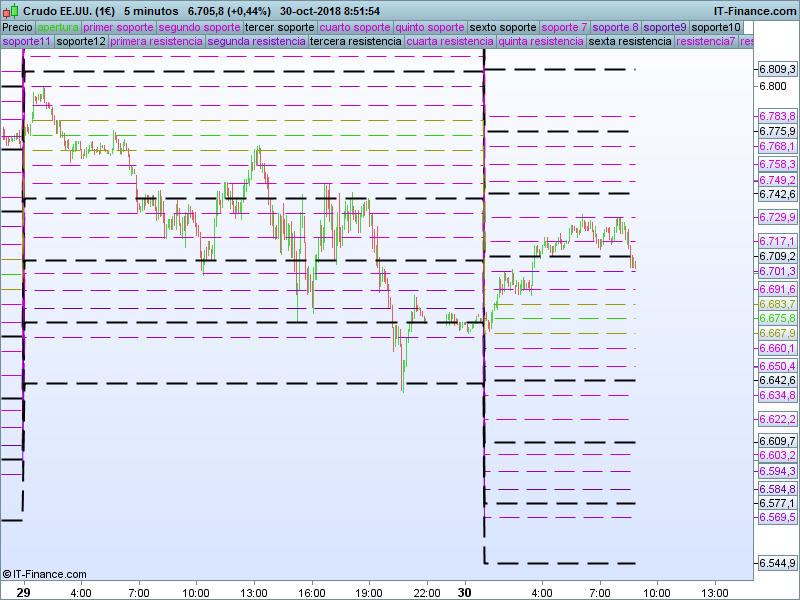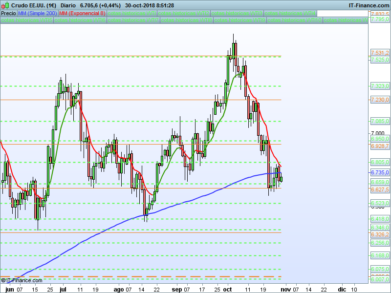 WTI, 08:48:13.- Cinco días tocando el SOR 6627. Si vemos un cierre por debajo de esta cota, podemos pensar en ir a buscar 6326, teniendo muy en cuenta la alta probabilidad de rechazo en el refugio 6418. Este punto nos rompería la estructura alcista que venimos manteniendo.