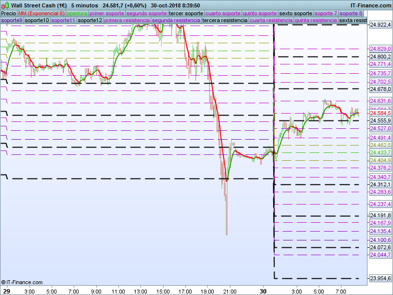 DOW JONES, 08:35:37.- Un nuevo mínimo mensual que nos llevó hasta el SOR 24189 (en donde tuvimos un fuerte rechazo en gráficos menores) y continuamos distanciándonos de la media de 200 sesiones. La sesión fue claramente de más a menos. Mientras continuemos por debajo de 25414 vamos a seguir considerando una predisposición bajista.