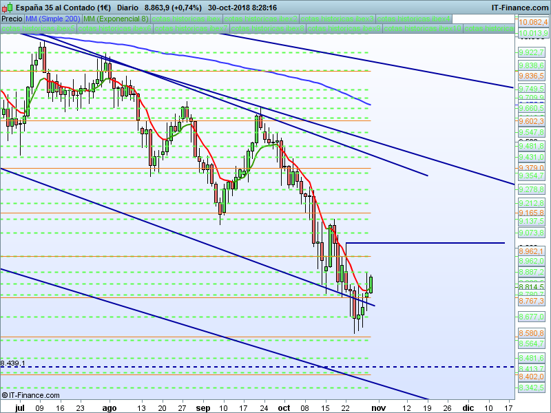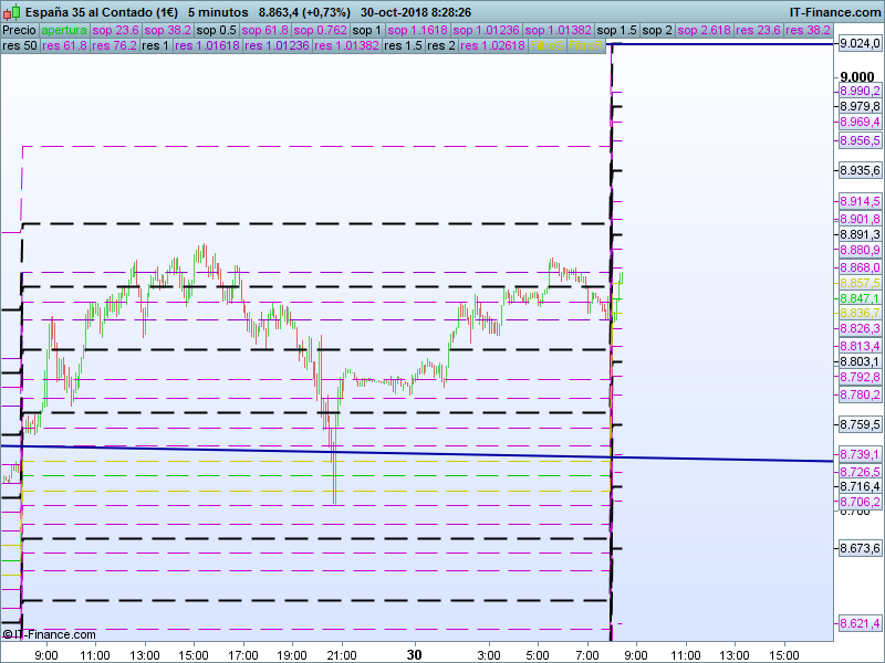 IBEX35, 08:27:02. Tenemos velas de indecisión propias de una corrección. Vamos a considerar como un primer nivel de posible reversión el SOR 8962, cierres por encima nos pueden indicar la formación de un suelo a corto plazo.