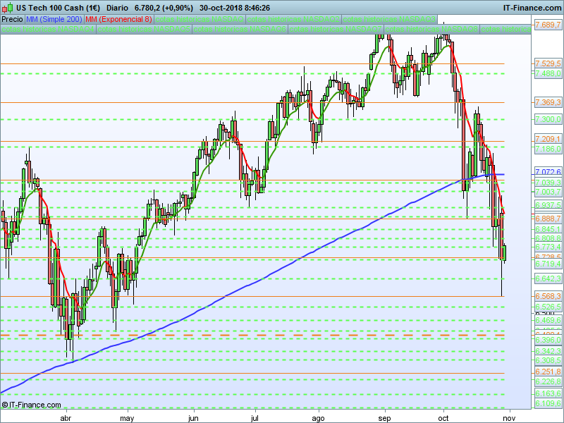 NASDAQ100,08:43:15.- Otro sesión de muy alta volatilidad recorriendo el precio 2 SORs, lo que equivale aprox a un 5%. Finalmente fuerte rechazo en el SOR 6568 y cierre en el SOR 6728. Vamos a considerar como posible punto de reversión los cierres por encima de 7048 y media de 200 sesiones. Vamos a obviar el gráfico intradiario ya que con la volatilidad que tenemos estos días vemos como nuestro sistema de SOR es absorbido con demasiada facilidad.