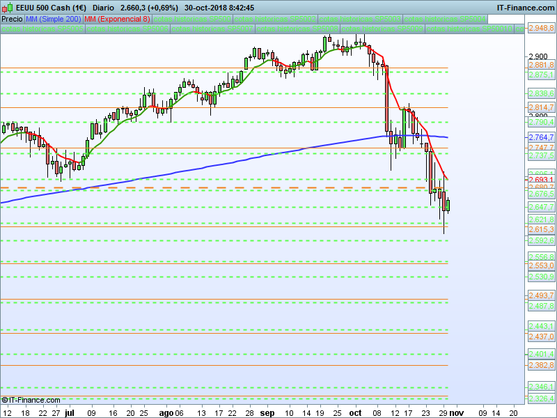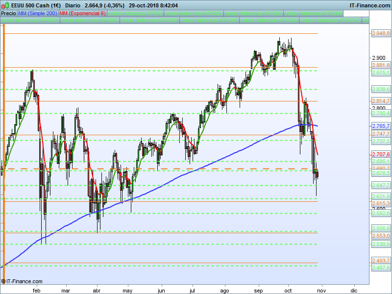 SP500,08:40:49.- Toque al SOR 2615, fuerte rechazo y es probable que vayamos de vuelta al PAA. Podríamos considerar el SOR 2747 como posible punto de reversión de la tendencia. Cierres por encima nos apuntarían a una posible formación de suelo, mientras continuemos por abajo, predisposición bajista.
