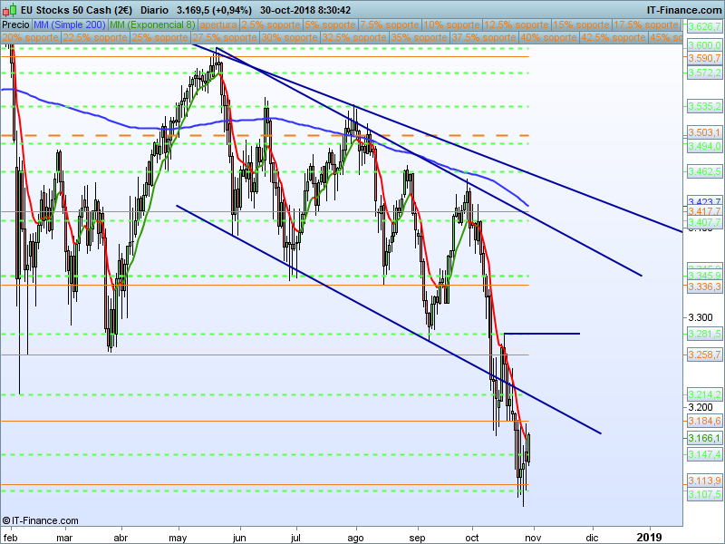 STOXX50,08:29:15.- Curiosa vela de indecisión la de ayer que cubrió 2 SORs anuales, es propia de manual. Por debajo de 3258 vamos a seguir considerando recorridos bajistas.