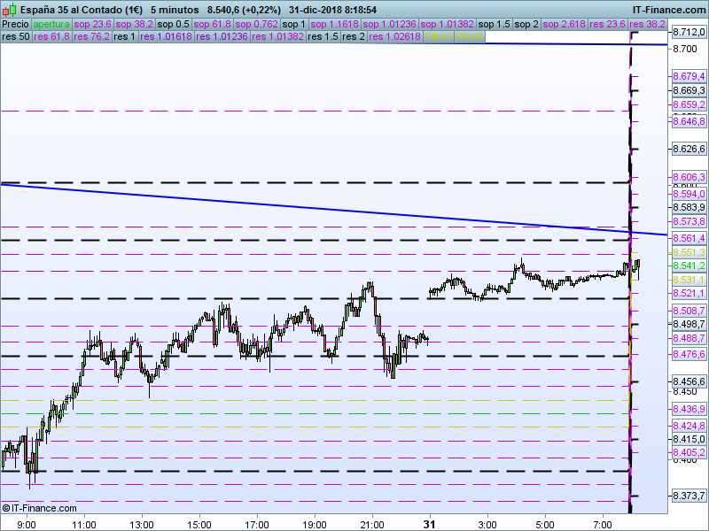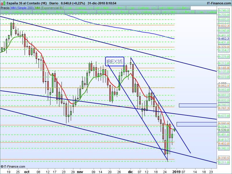IBEX35,08:31:21.- Con Alemania cerrada y el resto de Europa a medio gas, el único aliciente será ver si podemos cerrar el año por encima del nivel psicológico de 8500. Estamos en parte alta del canal y bajo SOR relevante 8580.