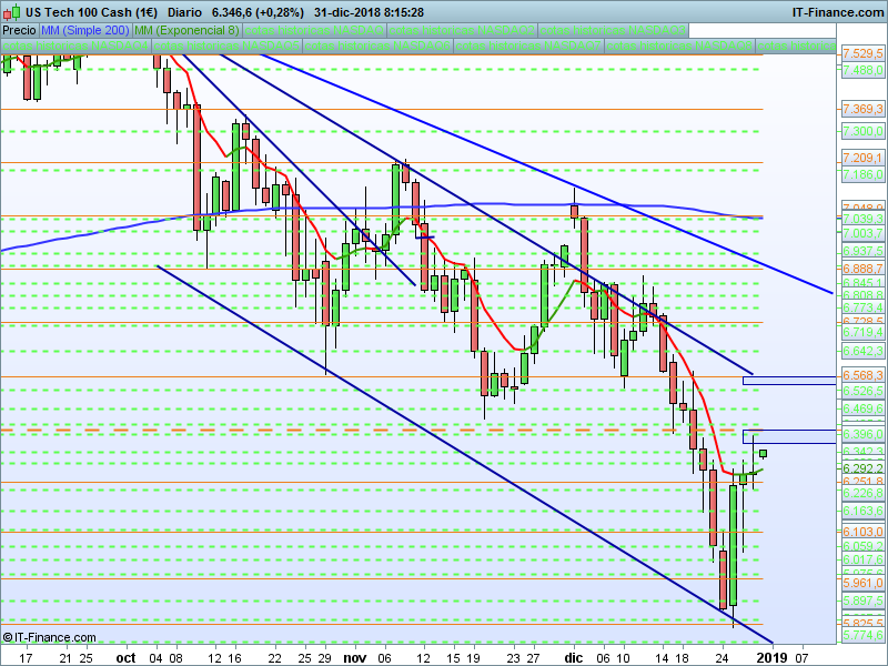 NASDAQ100,08:12:18.- El pasado viernes tuvo un rechazo importante antes de alcanzar el Precio de apertura anual en 6408. Veremos si hoy, con el viento de cola podemos alcanzarlo y así poder cerrar el año a cero.