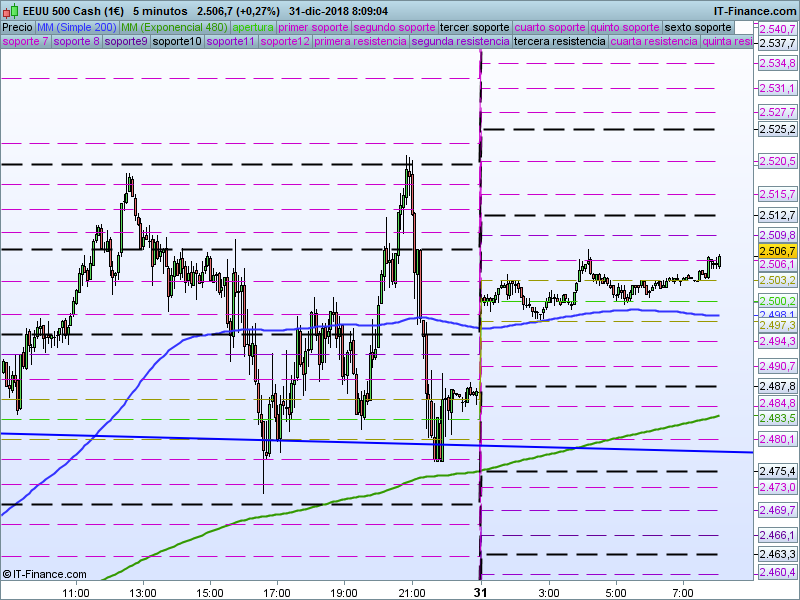 SP500,08:07:30- Al igual que en el caso del DOW, hemos abierto por encima del SOR 2493, que frenó el avance de la cotización en las 2 últimas sesiones. Mientras permanezca por encima la predisposición es ir a buscar el 2553 en primera instancia con extensión al SOR 2615. Veremos si es capaz de llegar al primer objetivo en el día de hoy.