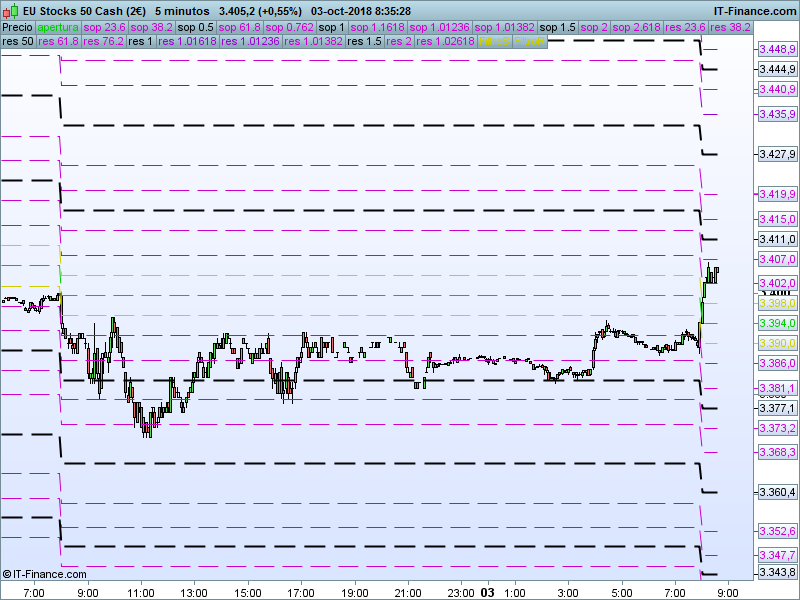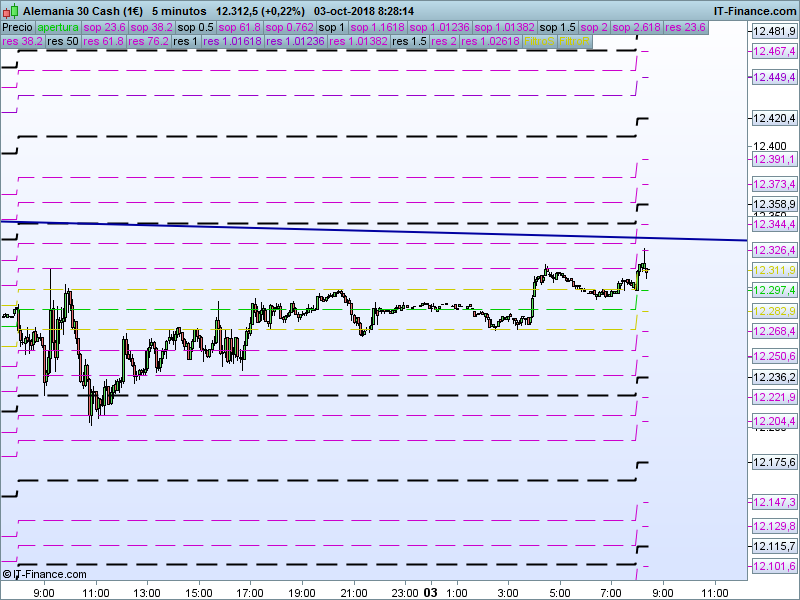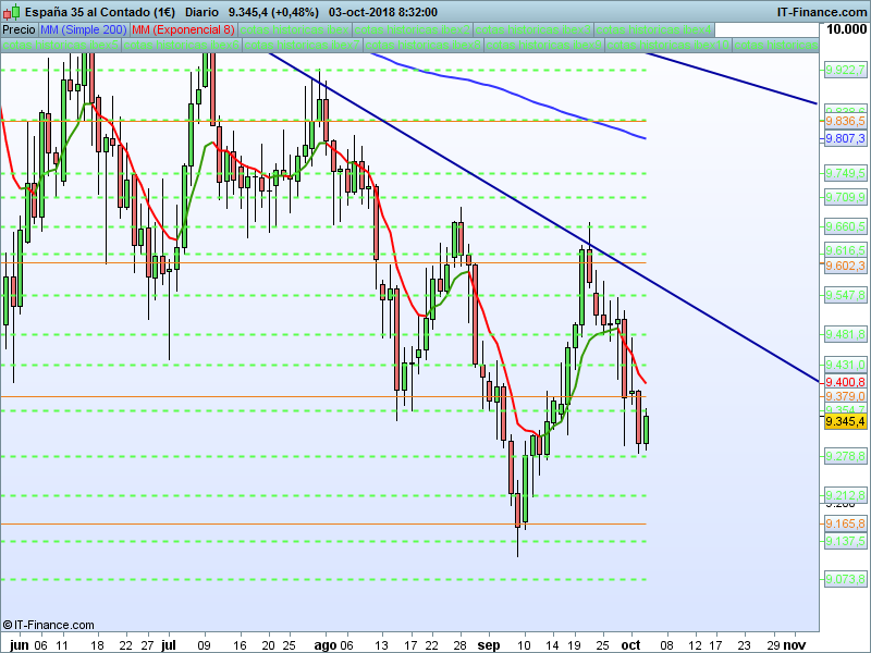 03/10/2018,08:14:34.- Continuamos lateralizando tras la caida del viernes, salvo sorpresas, esperamos que el movimiento bajista tenga continuidad, aunque la apertura se prevé ligeramente alcista. Hoy tenemos festividad en Alemania, por lo que no esperamos grandes movimientos en la sesión Europea. Como eventos macro más significativos tenemos la publicación de PMIs de varios paises de la UE, UK y EE.UU. En Europa la fuerza la tenemos en la Energia y Recursos básicos, mientras que Bancos, Retail, Telecos y Real Estate son los sectores más flojos a corto plazo.