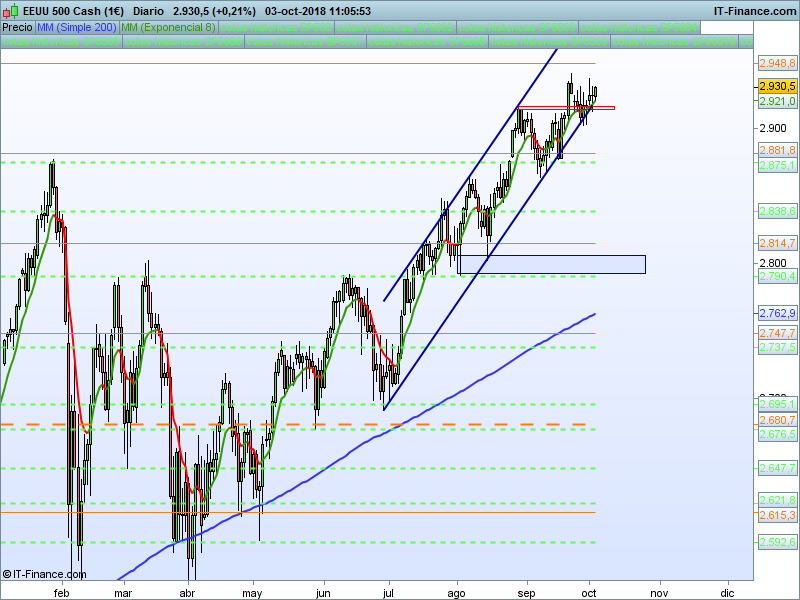 S&P500, 11:04:28.- Vela de indecisión en la que se volvió a mostrar rechazo en la zona del máximo anterior. Cierres por encima de este nivel nos deben hacer tomar predisposición alcista para ir a buscar los 2948/2950