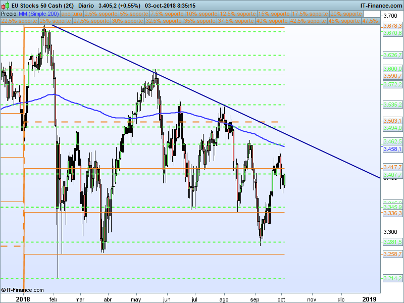 EUSTOXX 50. 08:36:44.-Apertura y cierre por debajo de la doble resistencia 3407/3417. El camino, mientras permanezca por debajo de estas resistencias, es ir a buscar los 3336.