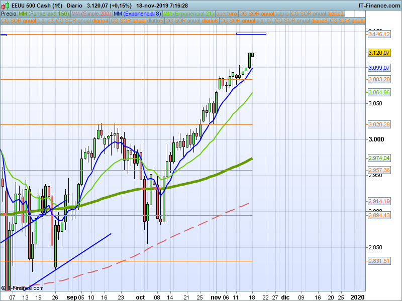 ¿Y cual es esta señal? Pues en el caso del SP500, tomando como referencia el gráfico diario, no podremos pensar que el movimiento tendencial se ha parado hasta que no veamos un cierre diario por debajo del SOR 3083, es decir, el mismo planteamiento que hemos mantenido durante toda la semana pasada.