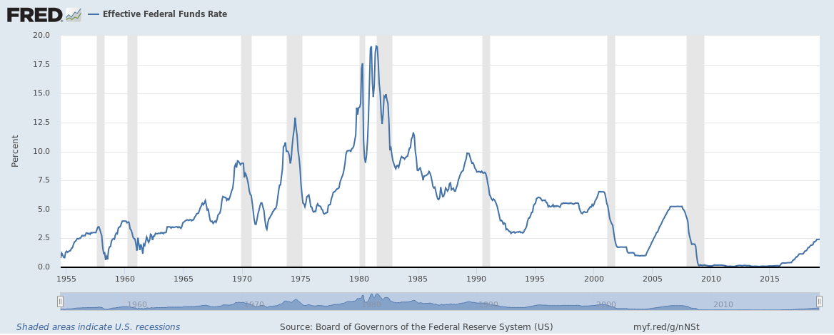 Las columnas sombreadas representan los periodos de recesión. ¿Qué ha pasado las últimas veces que se ha decidido poner fin a las alzas en los tipos?, efectivamente, recesión a la vista. Pero no es menos cierto que no siempre ha pasado esto, si atendemos a la serie histórica desde 1955. Al final, se trata de buscar excusas y justificaciones para todo.