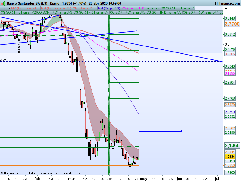 Banco Santander. Esperar hasta recuperar el PAT Publicado por Julio Fdezel 28 abril, 2020Tenemos el precio de apertura trimestral en 2.1360. Mientras estemos por debajo habría que mantener predisposición bajista, recuperando ese nivel, el primer punto de control será el 2.35, con posible extensión hasta 2.56.Seguir leyendoArtículo anterior DAX: MAPA OPERATIVO INTRADIARIOArtículo siguiente ADIDAS. Posible escenario operativo en corto.
