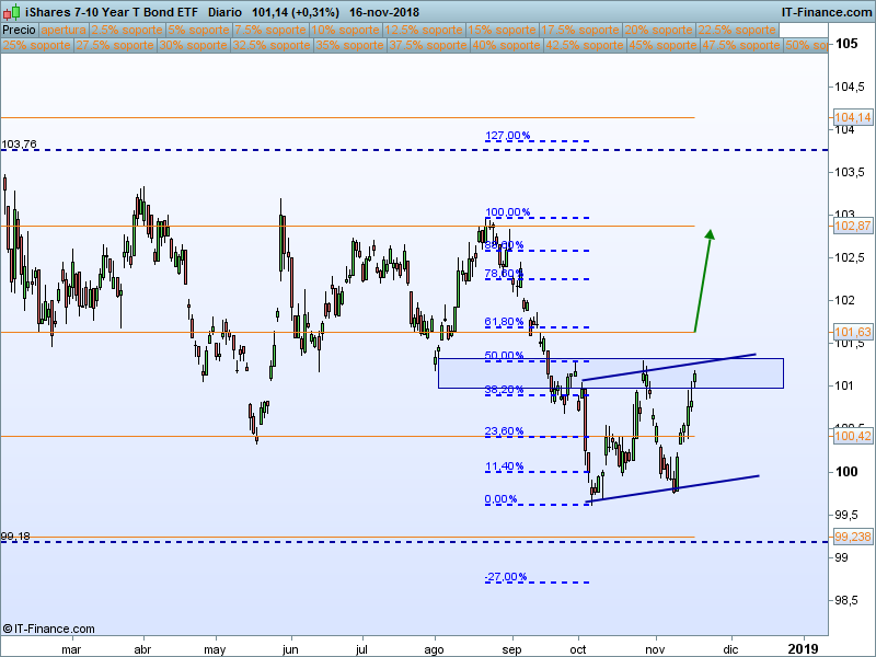 IEF, Tbond 7-10 años. Estamos justo en zona de los últimos máximos relevantes, dentro de los posibles movimientos podríamos estar dentro de la C de una plana. Vamos a considerar el SOR 101.63 como punto de posible reversión. La superación nos predispondrá en el lado largo.
